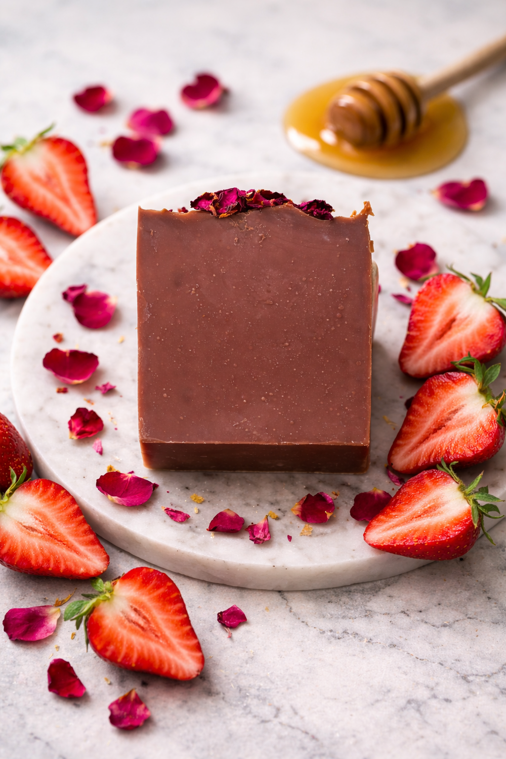 Ingredients: Olive Oil, Organic Coconut Oil, Avocado Oil, Shea Butter, Castor Oil, Distilled Water, Sodium Hydroxide (Lye), Phthalate-Free Fragrance Oil, Sodium Lactate, Mica, Dried Rose Petals.